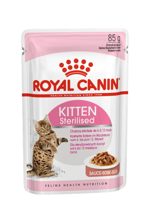 ROYAL CANIN Kitten Sterilised wet food has been specially developed for sterilised kittens between 6 and 12 months old. ROYAL CANIN Kitten Sterilised wet food helps strengthen your kitten's natural defenses.