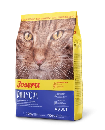Josera DailyCat is a grain-free cat food with special dietary fibre to counteract hairballs. Designed for adult cats with sensitive digestive systems. Daily extra portion of delicious poultry. Contains valuable fatty acids, vitamins and trace elements for healthy skin and a shiny coat, and carefully selected herbs and fruits enrich the recipe and provide a unique and varied taste experience.