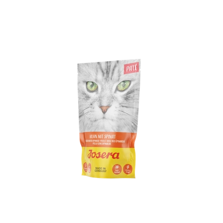 Whether a hunter, a shy purr or a conqueror of the sofa - JOSERA Paté tastes equally delicious to all feline heroes. The Josera Paté line of wet foods offers a wide range of tasty pates to add variety to your cat's diet. The optimally balanced foods contain high-quality meat and offal and all the nutrients necessary to keep your pet healthy and well-functioning. Complete food for adult cats. The special composition of ingredients keeps the urine pH at the right level and prevents kidney stones. Contains dietary fibre to prevent the formation of hairballs. Contains 70% tasty chicken with vegetables and salmon oil as a source of omega-3 and omega-6 fatty acids.