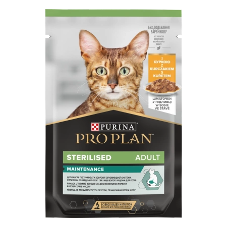 Purina Pro Plan Sterilised chicken is a complete and balanced food for adult cats with tender chicken pieces in sauce. It helps to maintain urinary tract health in cats after sterilisation surgery. PURINA PRO PLAN STERILISED NUTRISAVOUR contains all the essential nutrients your cat needs on a daily basis to enjoy a long and healthy life.