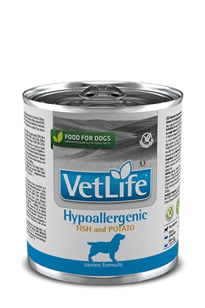 Farmina Vet Life Hypoallergenic Fish & Potato is a complete dietetic food for adult dogs designed to reduce nutrient intolerance and support the treatment of skin, eyes, ears, and perianal glands. Food with fish and sweet potatoes.