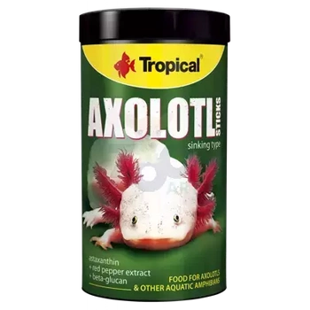 Food for axolotls and other aquatic amphibians. A special high-protein food in the form of sinking sticks for Mexican axolotls, Waltiel newts, clawed frogs and other aquatic amphibians whose diet consists of animal organisms. The abundance of animal ingredients, including fish, molluscs and crustaceans, provides a source of high-quality, easily digestible protein. A well-balanced composition of vitamins and trace elements means that regular feeding of AXOLOTL STICKS to amphibians ensures their proper growth and development, while the addition of astaxanthin and paprika extract intensifies the animals' colours. The addition of the natural immune stimulator beta-glucan strengthens the amphibians' immune system, supporting the regeneration processes occurring after possible biting by fellow aquarium inhabitants.