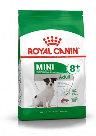 ROYAL CANIN Mini Adult 8+ food has been developed for small breed dogs weighing up to 10 kg and over 8 years of age. The recipe is tailored to the nutritional needs of small breed dogs. The food contains the right level of nutrients to help maintain the vitality of small breed dogs showing the first signs of aging. Some small breed dogs are picky eaters. That's why ROYAL CANIN Mini Adult 8+ contains a unique combination of natural aromatic substances.