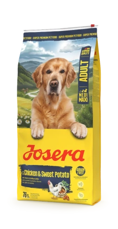 Josera Medi/Maxi Chicken & Sweet Potato is a well-tolerated, potato-free dog food for active medium and large breeds. This grain-free recipe with sweet potatoes, tasty chicken, and dietary fiber is highly digestible. Vitamin E and L-carnitine provide extra energy for our four-legged, active dogs.