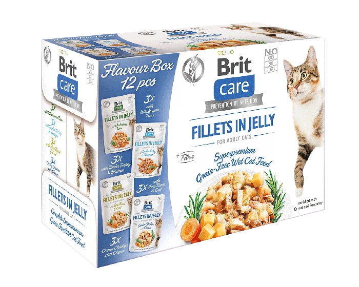 Brit Care Cat Pouch Fillets in Jelly with Fine Trout & Cod: crude protein 8.5%, crude fat 4.0%, crude fiber 0.5%, crude ash 2.0%, moisture 82.0%, calcium 0.25%, phosphorus 0.2%, sodium 0.3%. Brit Care Cat Pouch Fillets in Jelly with Wholesome Tuna: Crude Protein 9.0%, Crude Fat 3.0%, Crude Fiber 0.5%, Crude Ash 2.0%, Moisture 82.0%, Calcium 0.25%, Phosphorus 0.2%, Sodium 0.3%