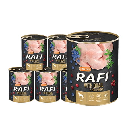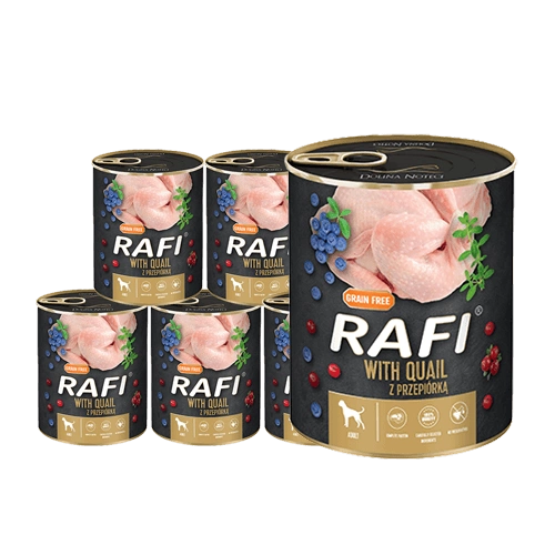 Complete wet food for adult dogs of all breeds - with quail. What distinguishes Rafi wet food with quail is its high protein content with a rich amino acid composition (phenylalanine and cystine). The meat and raw materials from quail, especially its fat, are a source of valuable polyunsaturated fatty acids of the n-6 family, which regulate a number of bodily functions. Thyme, thanks to its oils and biologically active substances, has a relaxing effect on the gastrointestinal musculature and stimulates the secretion of digestive juices. Furthermore, it enhances the palatability of the feed. Blueberries and cranberries enrich the composition with a range of vitamins and nutrients.