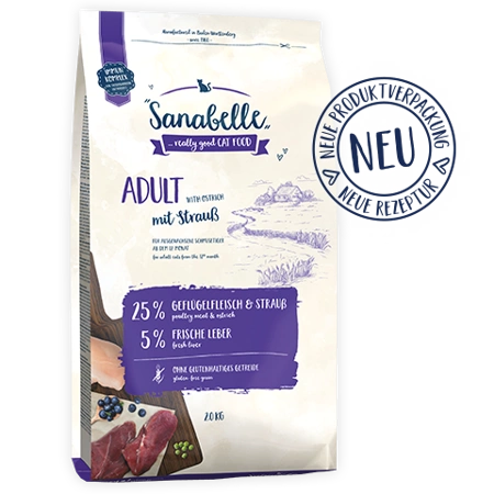 • Sanabelle Adult with ostrich meat is a food without cereals containing gluten. Its perfectly balanced formula containing tender ostrich meat makes it not only very tasty, but also easy to digest and digest.