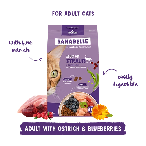 BOSCH Sanabelle Adult Ostrich is a food designed for adult cats that spend most of their time indoors. When choosing a diet for your couch potato, remember that they are no different from their other companions in terms of nutrition. By nature, every cat is a carnivore, so it's important to ensure their diet is rich in high-quality animal protein. Furthermore, cats are notorious for frequent digestive issues and sensitive stomachs. A cat deprived of regular contact with the outside world can have difficulty distinguishing between seasons, causing it to shed fur constantly. Therefore, if your pet spends time indoors, it is at risk of ingesting more hairballs, which can cause intestinal problems.