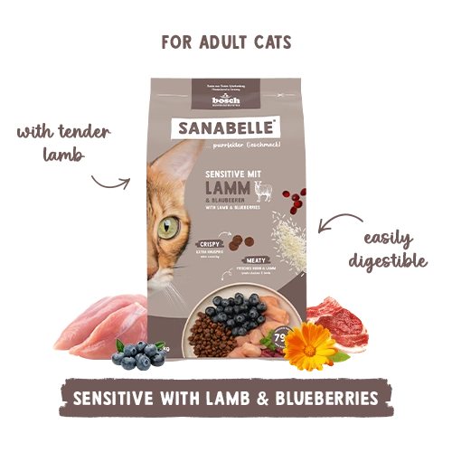 Sanabelle Sensitive with tender lamb has been specially developed for cats with sensitive digestive tracts. Thanks to its high concentration of nutrients, it allows you to reduce food intake and relieve the strain on the digestive system. The special formula is particularly easy to digest and assimilate. The tender lamb meat is an excellent source of protein and does not cause allergic reactions.Sanabelle Sensitive is, thanks to its exceptional palatability, the ideal food also for very fussy cats.