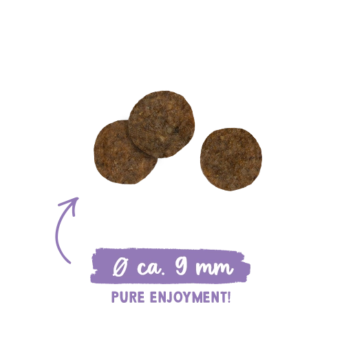 Fresh poultry (min. 20%), potato flakes, potato flour, poultry meal, potato protein, hydrolyzed protein, liver (dehydrated), cellulose fiber, beet pulp (desugared), flaxseed, peas (dehydrated), yeast (dehydrated), animal fat, potassium chloride, cranberries (dehydrated), blueberries (dehydrated), mussel powder, chicory powder, marigold flowers (dehydrated), yucca extract (dehydrated). Percentage of animal protein: min. 51.1%. Percentage of animal protein in total protein: min. 85%.