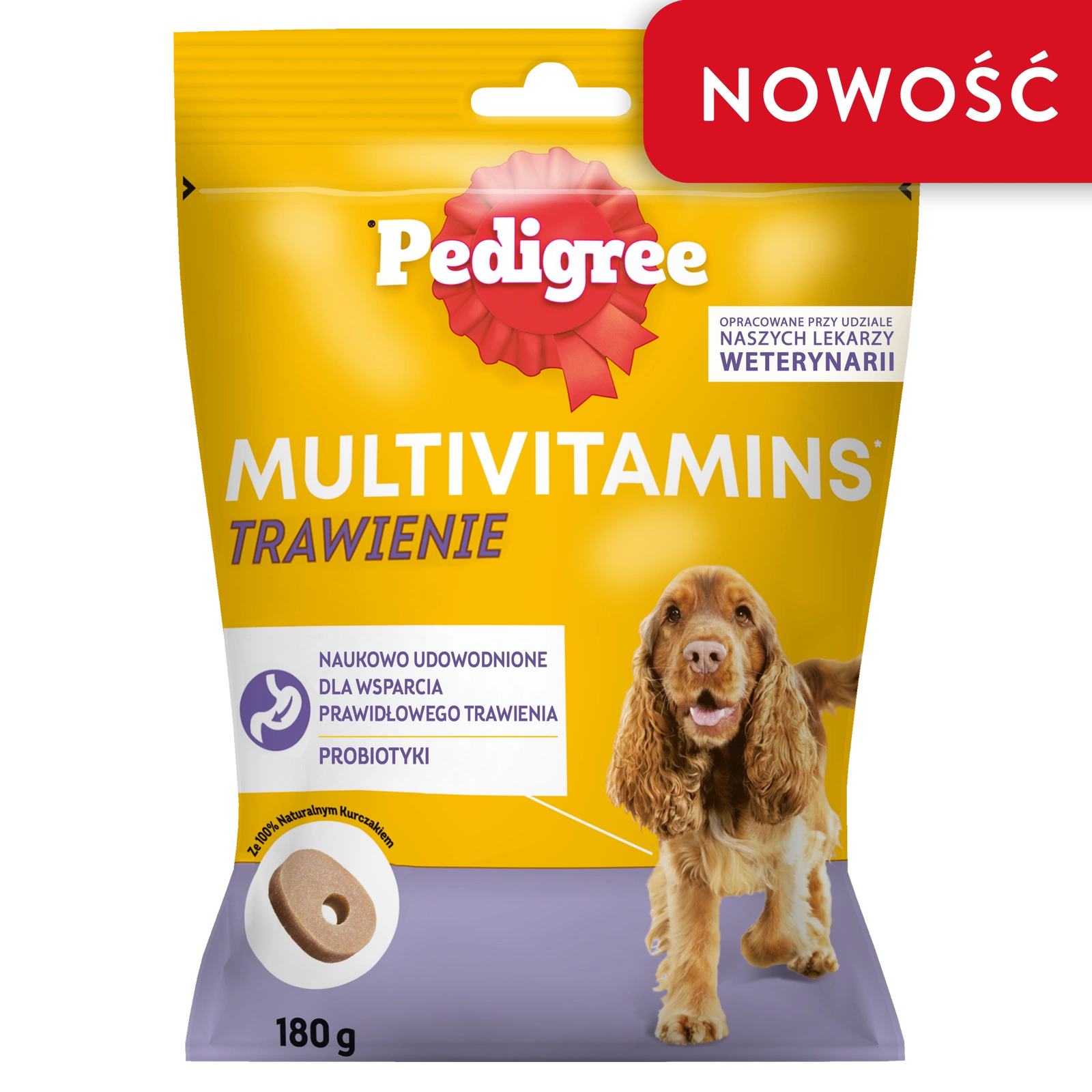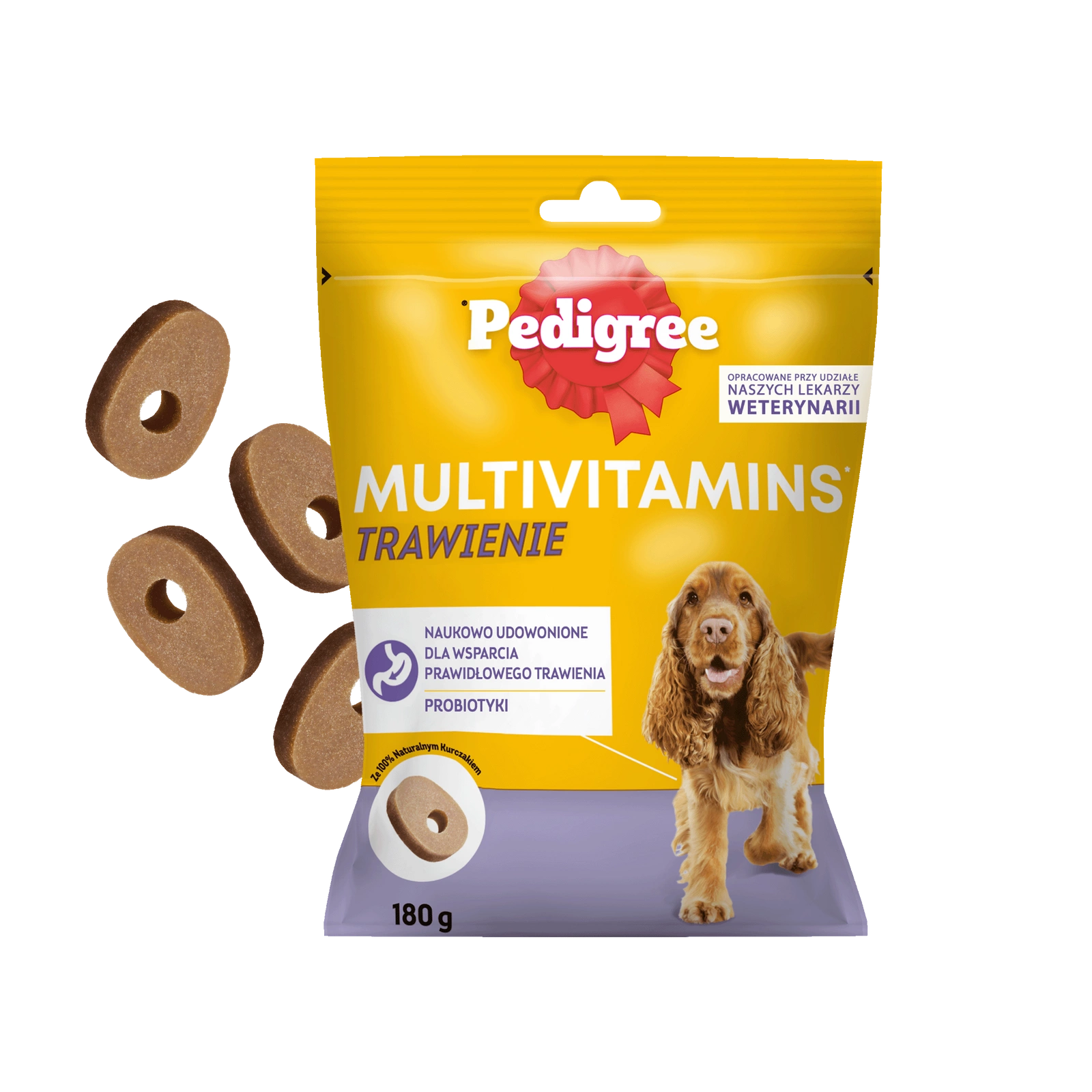 - PEDIGREE® Multivitamins Digestion is a chicken-flavored complementary food for adult dogs.