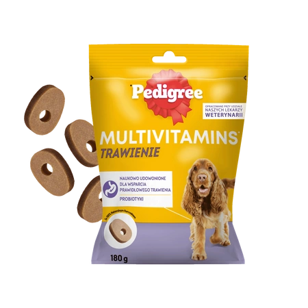 PEDIGREE® Multivitamins Digestion is a chicken-flavored complementary food for adult dogs. Thanks to the presence of probiotics (Bacillus velezensis), it helps maintain a healthy gut microbiome and supports digestion, which has been scientifically proven. The formula was developed by veterinarians and nutritionists from the WALTHAM™ Institute of Animal Science. With PEDIGREE® Multivitamins Digestion, you can effectively support your dog's health and vitality. Each serving contains a specially selected blend of multivitamins and probiotics. This complementary food is formulated with the highest quality ingredients, without the use of artificial colors or flavors. Each package contains approximately 30 pieces.