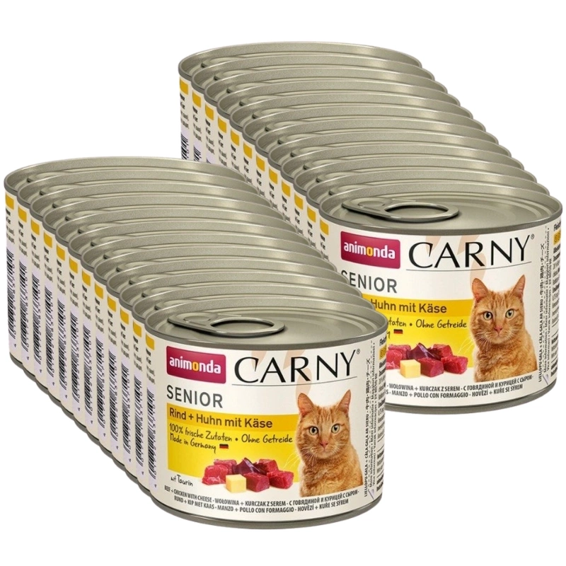 Complete food for senior cats over 7 years of age. The food is prepared from exclusively selected types of high quality meat. Animonda CARNY is made with fresh and juicy pieces of meat, gently prepared without the addition of supplements or substances to improve the appearance or taste. Free from soya, colourings and artificial preservatives, and genetically modified ingredients, it has the natural taste of meat that cats love more than anything else in the world. Beef and chicken flavoured food with cheese.