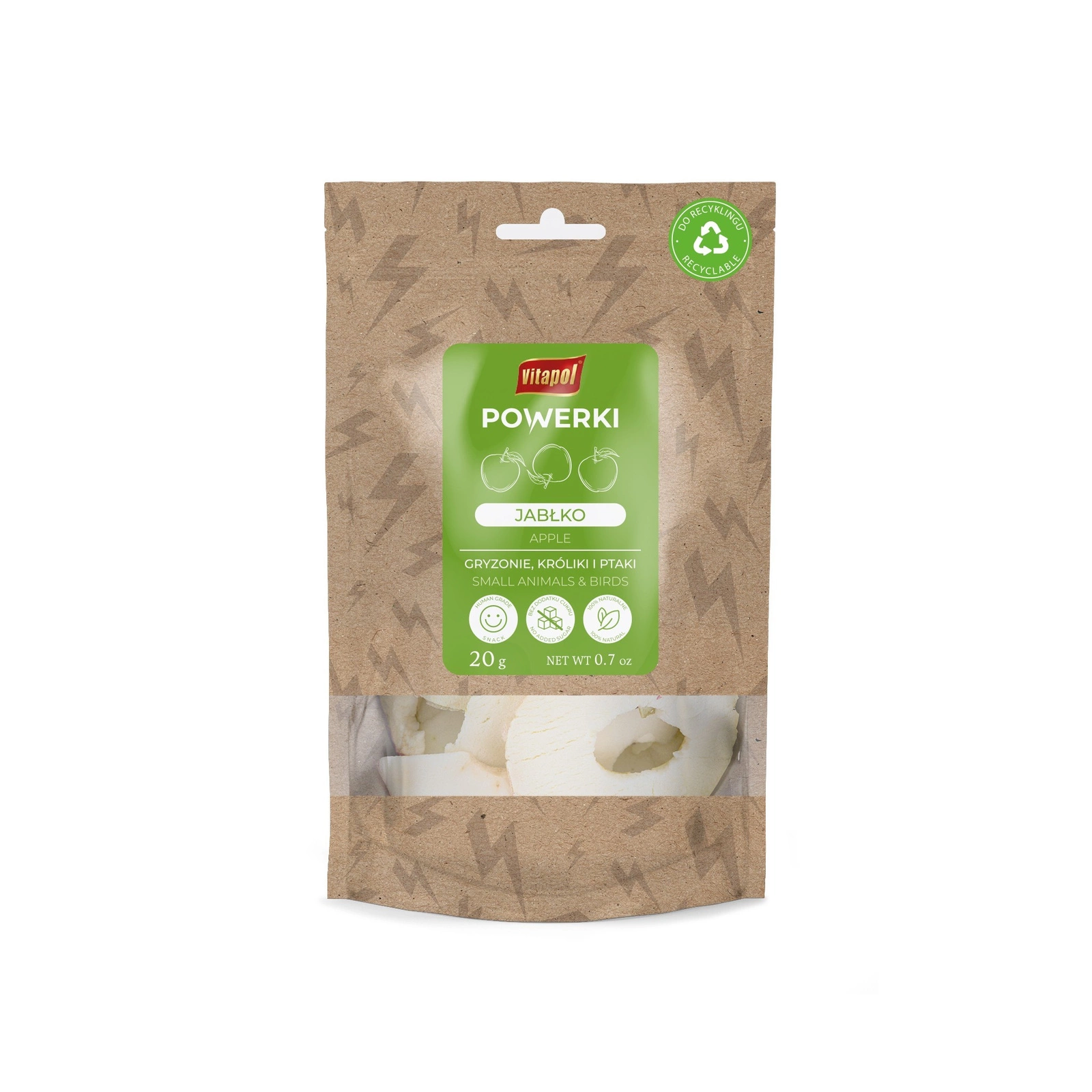 Powerki Freeze-dried Apple is a healthy and tasty snack for rodents, rabbits and exotic birds. Thanks to the freeze-drying process, apples retain their valuable nutrients, offering a wealth of vitamins, minerals and fibre.