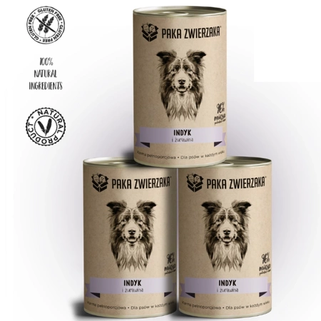 This natural wet food is a complete and balanced meal for dogs of all ages. Contains 96% turkey with broth! Prepared with the highest quality, fresh and juicy meat and offal. Rich in nutrients and highly digestible sources of animal protein. Using a single type of protein, this food is suitable for reducing the risk of allergies and food intolerances.