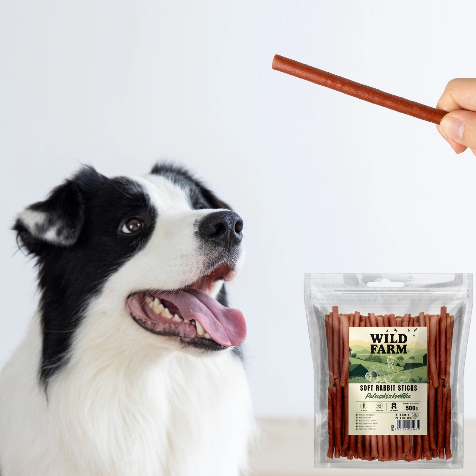 WILD FARM Rabbit Sticks are an excellent choice for dogs who appreciate the intense flavor of meat and a light, flexible texture. 80% rabbit meat provides exceptional palatability and aroma, and thanks to their grain-free formula, the treat is easily digestible and suitable even for dogs with sensitive digestive systems.