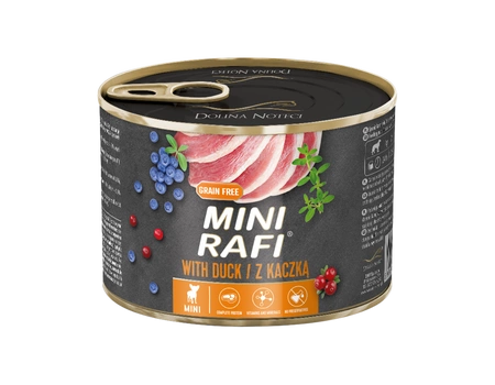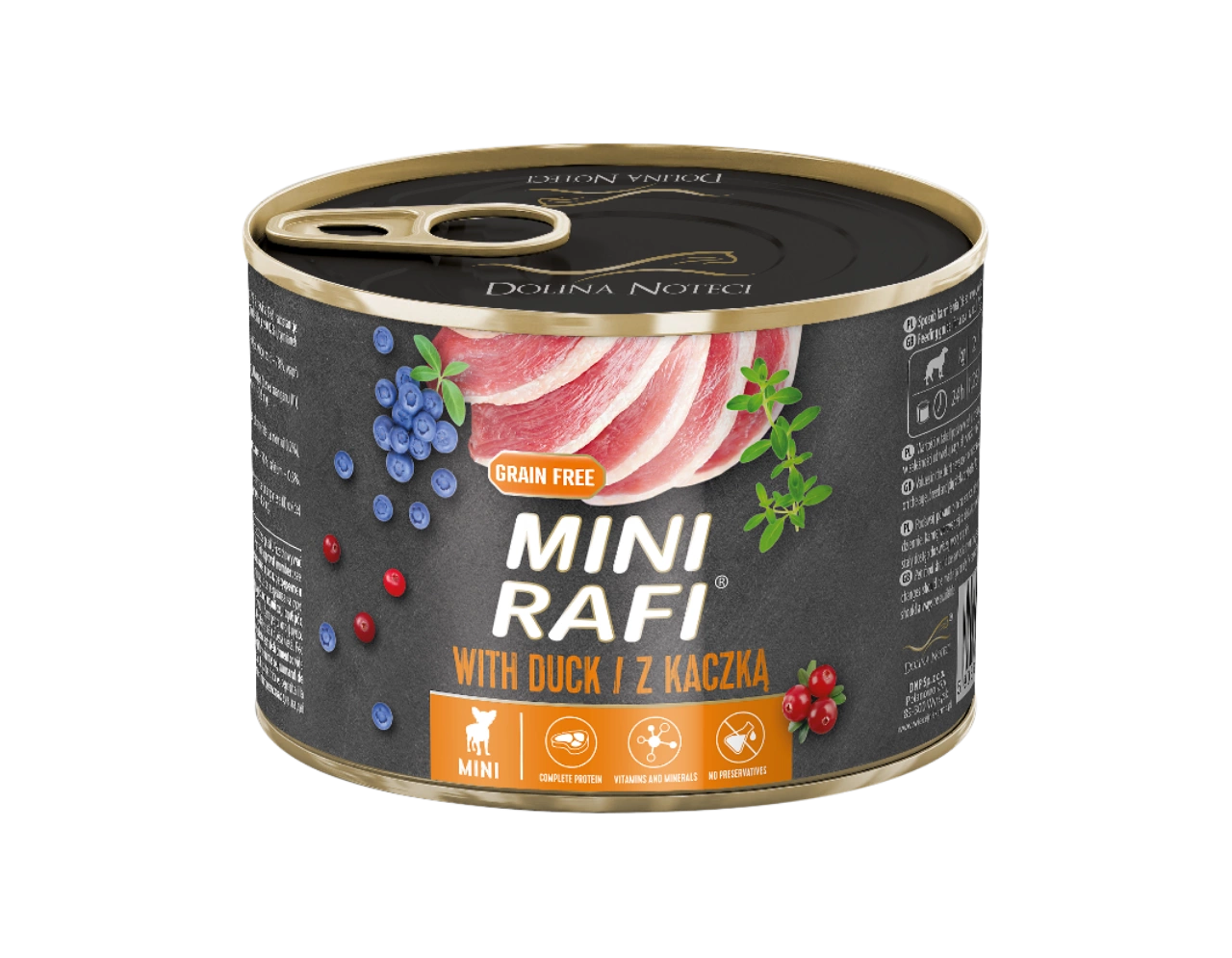 When we think about small breed dogs, we often fail to realize how demanding their nutritional needs are. They're not just a sweet-looking little friend, but also a predator and carnivore. Such a dog requires meat-based foods made from carefully selected ingredients in their diet. With this in mind, we've created Mini Rafi wet food, which supports their condition and health. High-quality meat and animal-based ingredients guarantee easily digestible protein, while the addition of salmon oil ensures the optimal ratio of omega-3 and omega-6 fatty acids. A wealth of vitamins and minerals will ensure not only excellent condition but also a healthy skeletal system, digestive system, and immune system. Mini Rafi wet food is a healthy meal that no dog—even the pickiest—can resist.