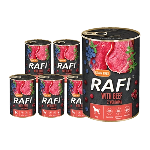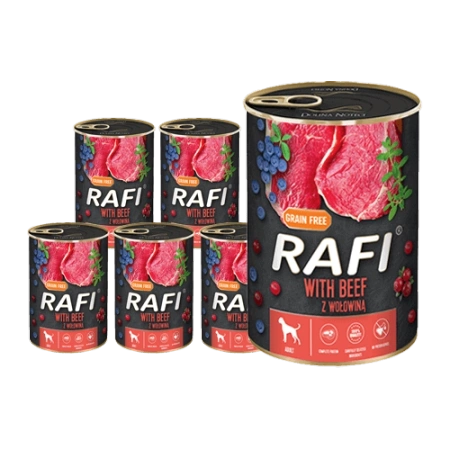 Rafi wet food with beef for adult dogs of all breeds, is characterised by a high content of complete protein with a low fat content. In addition, the meat and raw materials derived from beef are a valuable source of lysine and histidine. The recipe has been enriched with the addition of blueberries and cranberries, which, thanks to the bioactive compounds they contain, mainly procyanidins and flavonoids, have strong antioxidant and anti-inflammatory properties. Thyme, on the other hand, has an antibacterial effect and a beneficial influence on digestive functions.
