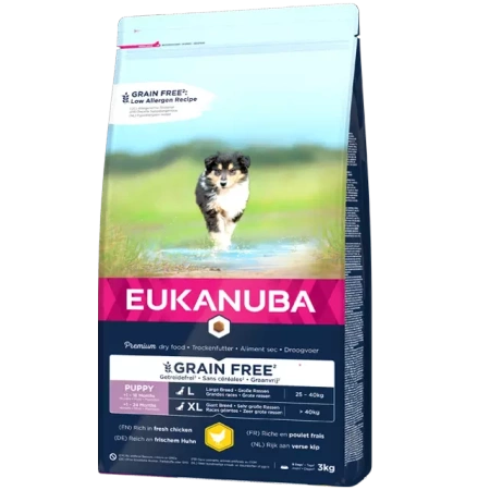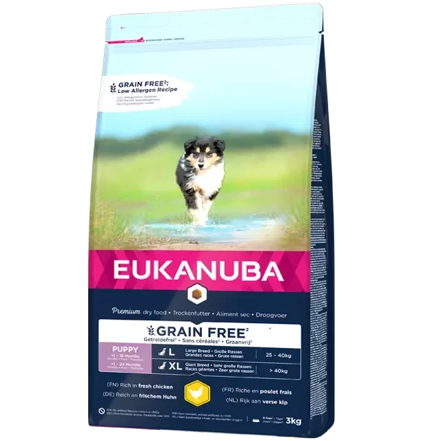 EUKANUBA Grain-Free* Puppy Food for Large and Giant Breeds is rich in fresh chicken to support lean muscles. The recipe contains antioxidants and vitamins to support a strong immune system, and added gluten-free* sweet potato provides a natural source of fiber and minerals. To further support healthy digestion, this recipe includes beet pulp, prebiotics FOS and MOS. Additionally, it contains calcium, which supports bone development.