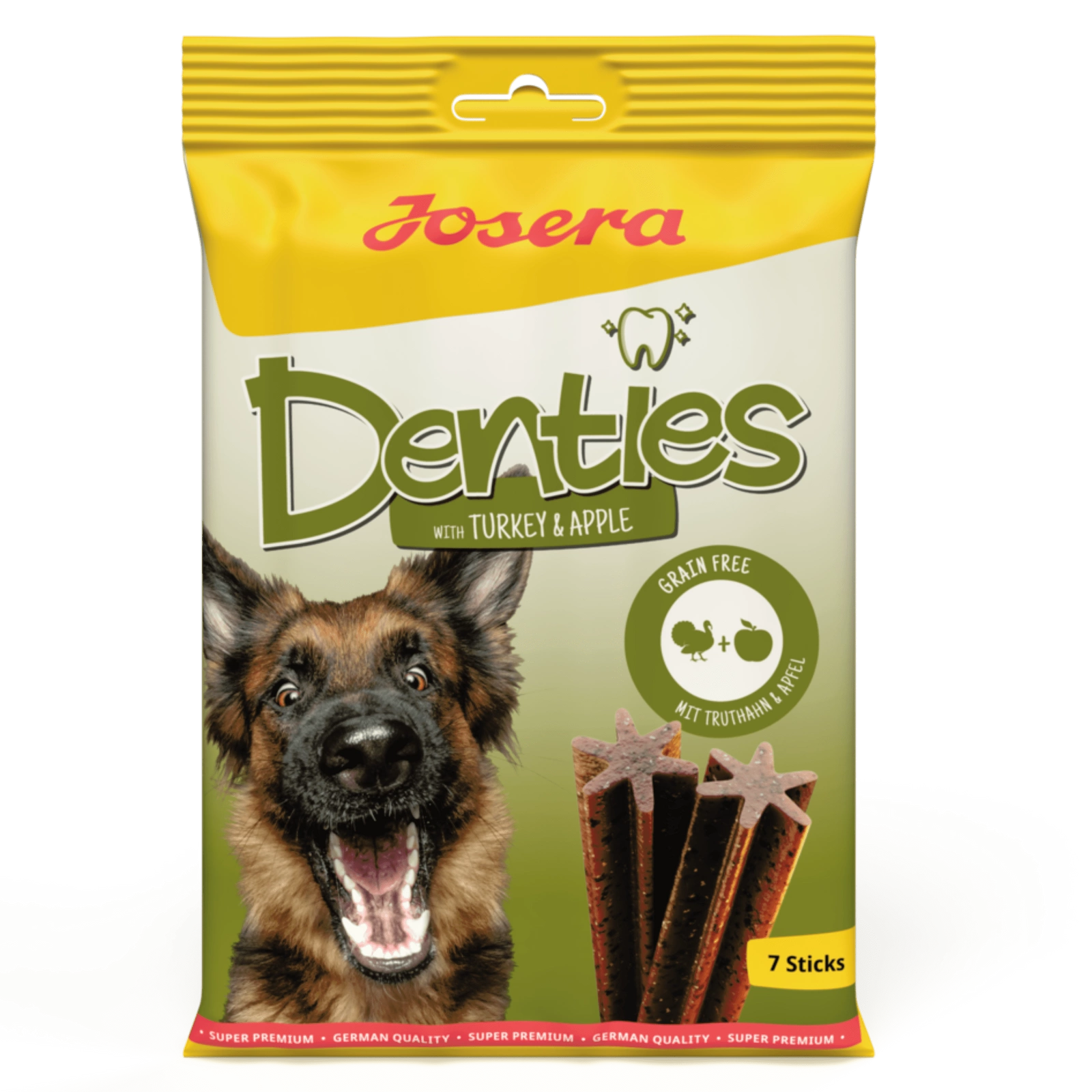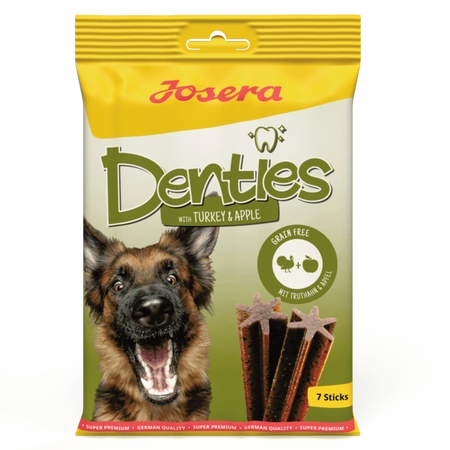 Our new Josera Denties with Turkey and Apple make dental care your dog’s new favorite activity! The cellulose in these treats provides gentle cleaning action, helping maintain good oral hygiene. The delicious combination of turkey and apple ensures an irresistible taste.