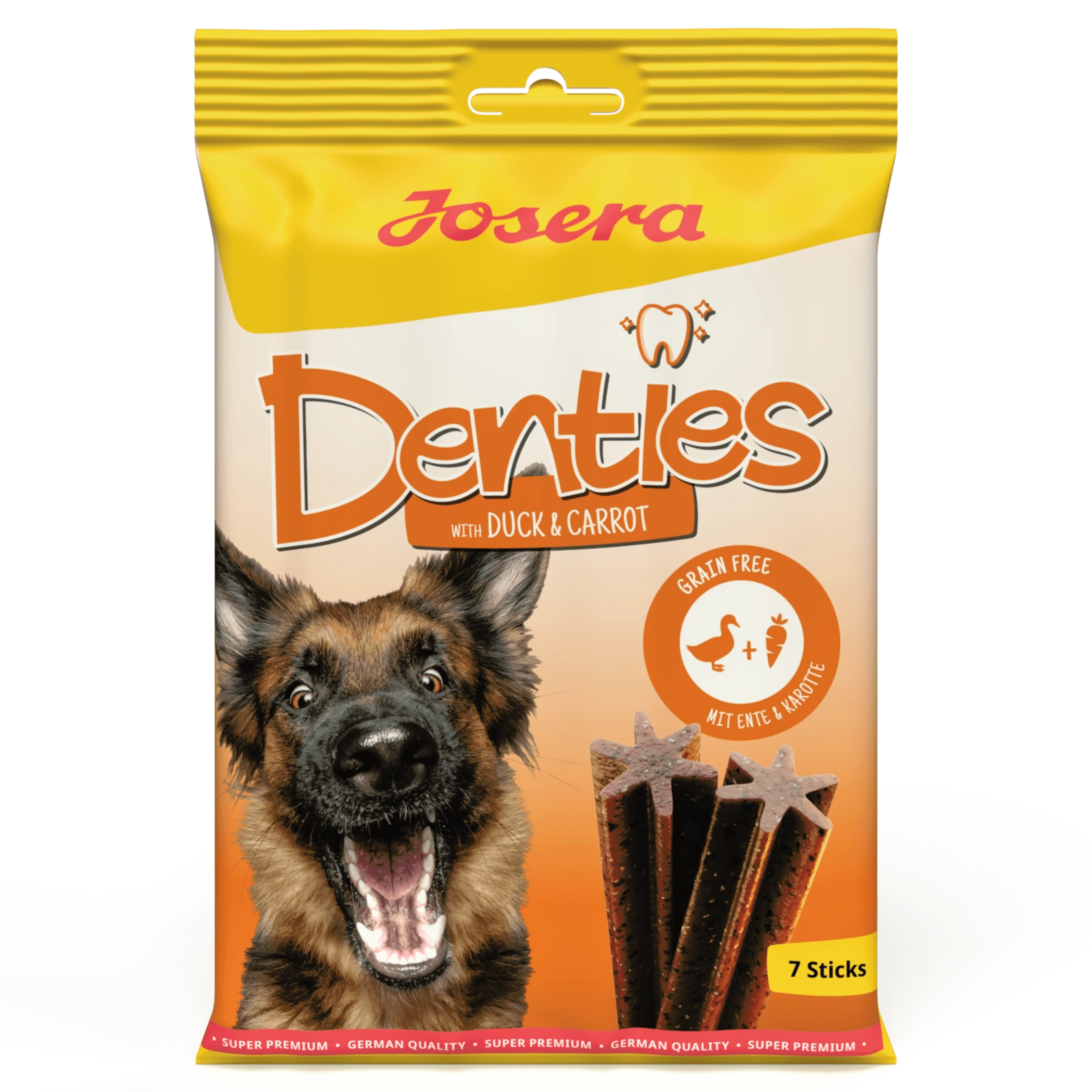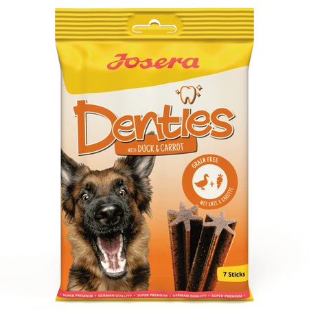 Our new Josera Denties with Duck and Carrot make dental care your dog’s favorite activity! The cellulose in these treats provides gentle cleaning action to help maintain your dog’s oral hygiene. The specially designed star shape and ideal texture make daily dental care easy and enjoyable. Plus, the delicious duck and carrot flavor combines health benefits with great taste!