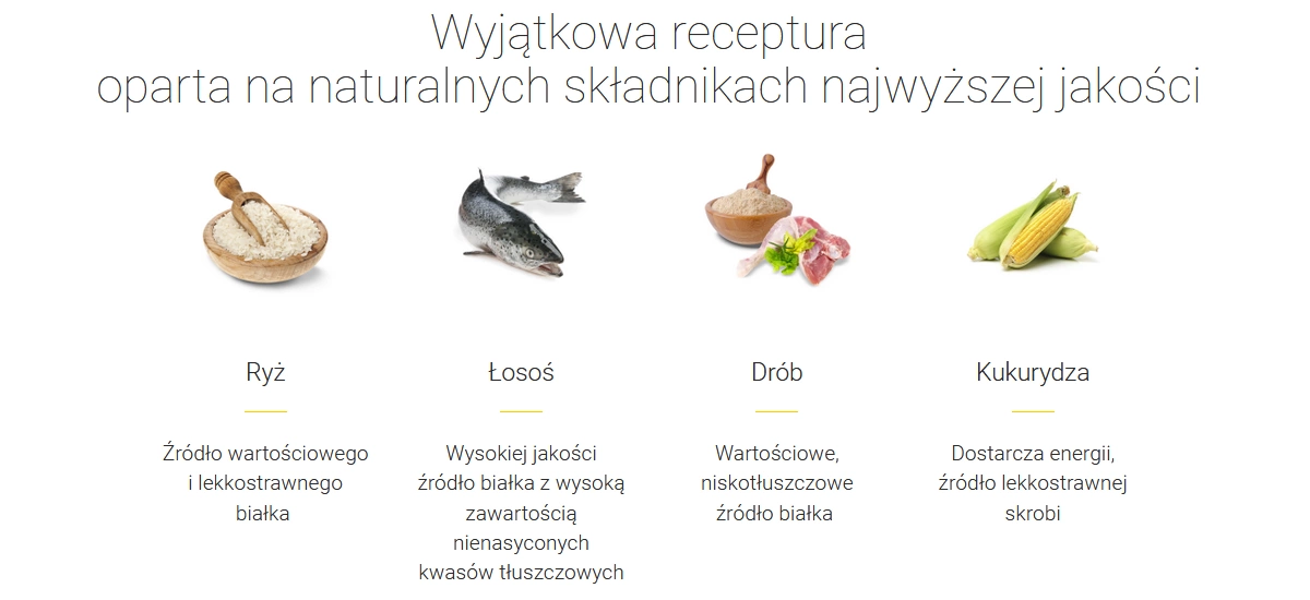 Dried poultry protein, rice, whole grain corn, poultry fat, dried salmon (6%), beet pulp, hydrolyzed poultry protein, plant fibers, minerals, dried chicory root (natural source of inulin).