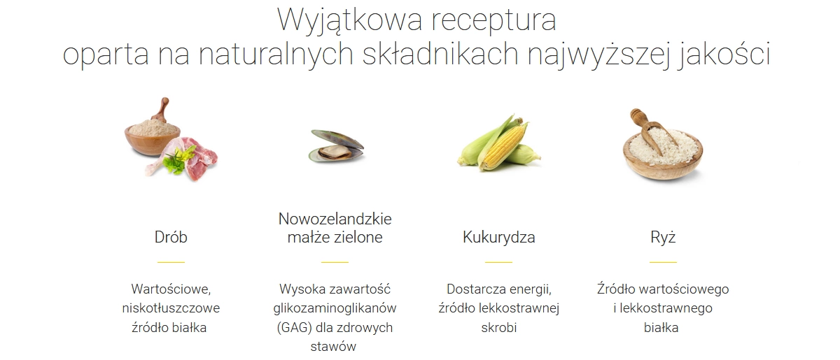 Ingredients: dried poultry protein 27.5% (including chicken 40.0%); whole grain corn; Rice (25%); beet pulp; poultry fat; hydrolyzed poultry protein; minerals; salmon oil (0.8%); yeast; dried chicory root (natural source of inulin); dried New Zealand green-lipped mussel (Perna canaliculus)