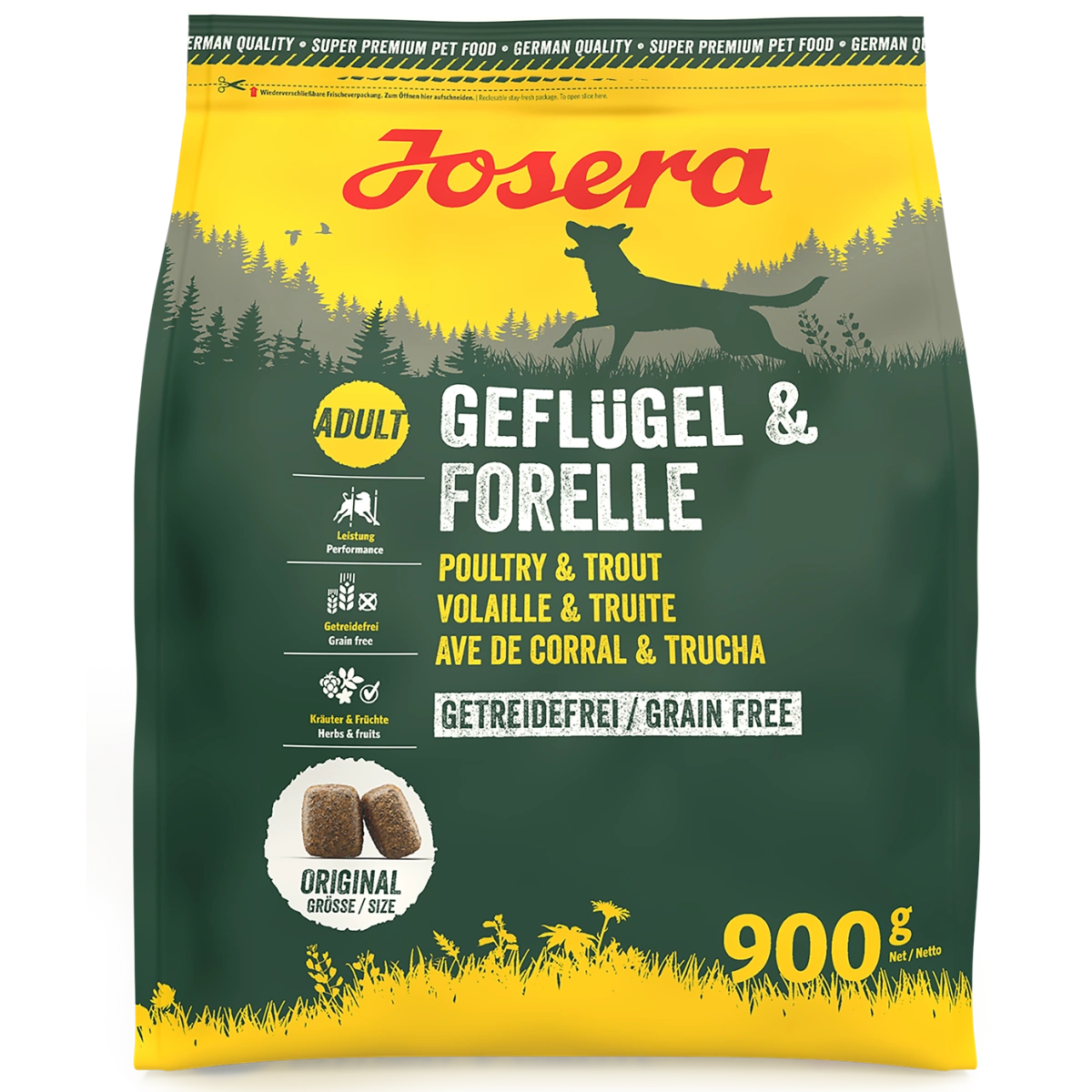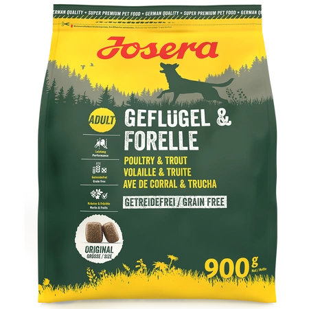 Ingredients: dried poultry protein 31%, dried sweet potatoes, pea flour, poultry fat, potato starch, dried trout 6%, beet pulp, hydrolysed poultry protein, yeast, apple pomace, carob flour, minerals, herbs, fruits, dried chicory root (a natural source of inulin), dried meat of New Zealand green-lipped mussels (Perna canaliculus).