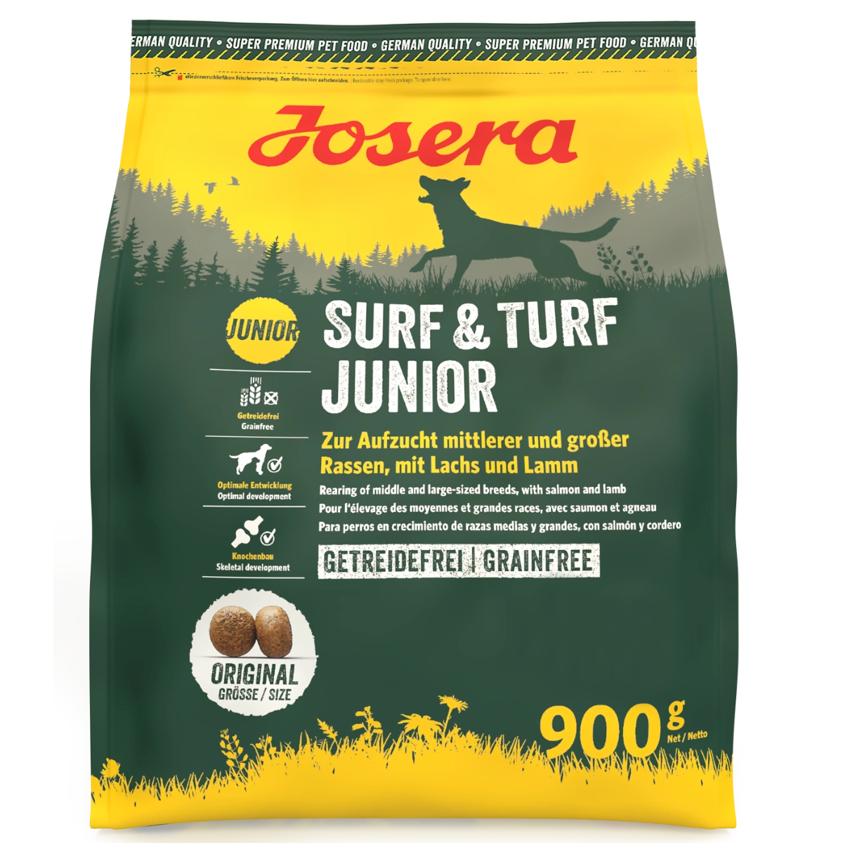 Josera Surf & Turf Junior contains high-quality protein from lamb and salmon, providing a nutritious and flavourful daily menu for growing dogs. It is free from poultry protein, making it ideal for pets with poultry allergies. It contains everything dogs need for healthy development.