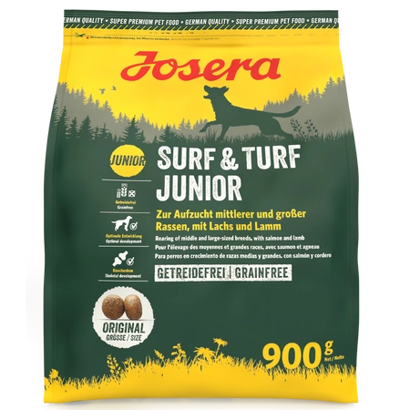 Josera Surf & Turf Junior contains high-quality protein from lamb and salmon, providing a nutritious and flavourful daily menu for growing dogs. It is free from poultry protein, making it ideal for pets with poultry allergies. It contains everything dogs need for healthy development.