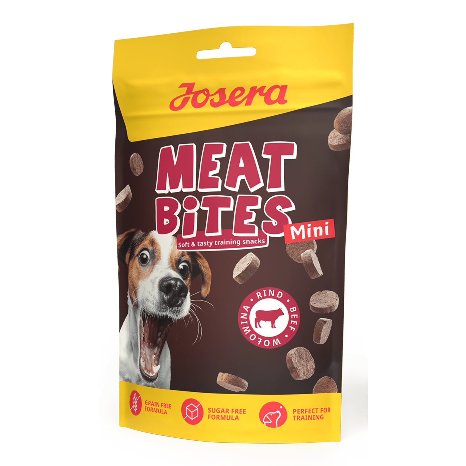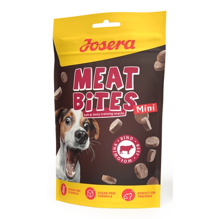 Delicate flavour in every bite! Josera Meat Bites Mini with beef are the perfect training treats specially designed for small dogs. Containing as much as 90% meat, they offer an exceptional taste without any grains or sugar. Their soft texture and small size make them ideal for small mouths and easy to portion.