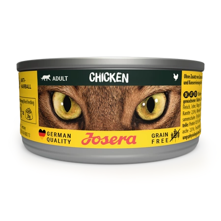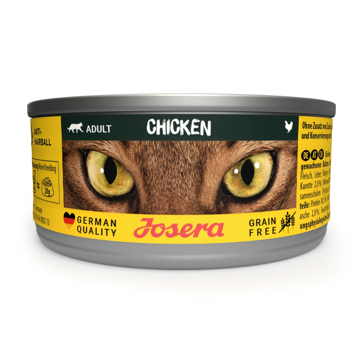 Mmm, time for a delicious change! Our new range of canned wet cat food offers even more choice and even more flavors in its bowl. Your pet will be delighted with the delicious Josera Chicken dish with tender chicken. The grain-free recipe is enriched with salmon oil, which provides essential omega-3 fatty acids and enhances the palatability.