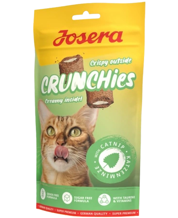 Josera Crunchies snacks are very appealing to cats thanks to their creamy filling. And now they've been added with catnip, making them irresistible. These snacks with a crunchy shell and creamy filling will also convince cat owners, as they contain valuable vitamins, taurine, and have an anti-hairball effect! Plus, the recipe is low-calorie and grain-free.