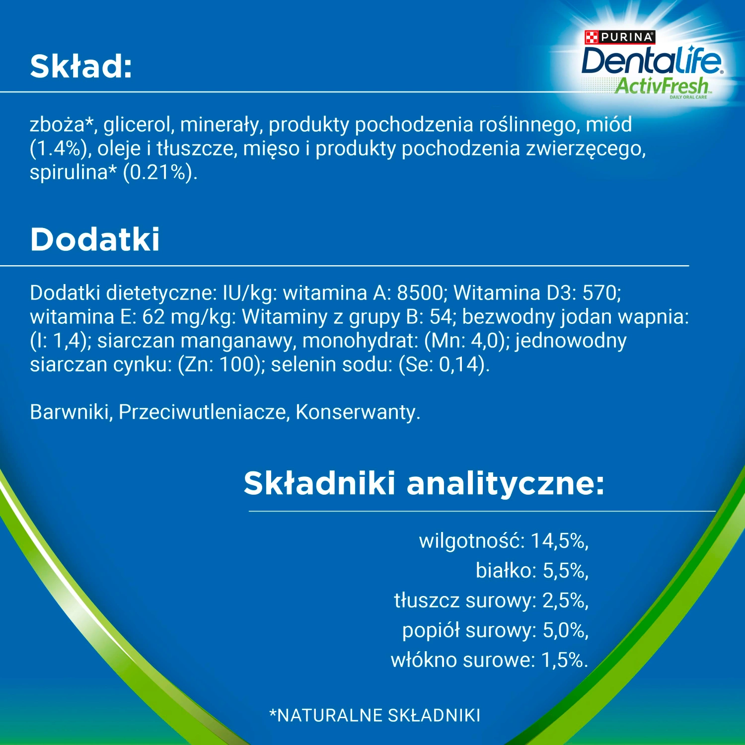 Purina Dentalife ActiveFresh with natural spirulina and honey doesn’t just mask bad breath temporarily but is designed to neutralise the bacteria responsible for its formation. The shape, size, and spongy texture of ActiveFresh are based on the scientifically proven Dentalife formula that reduces tartar build-up.