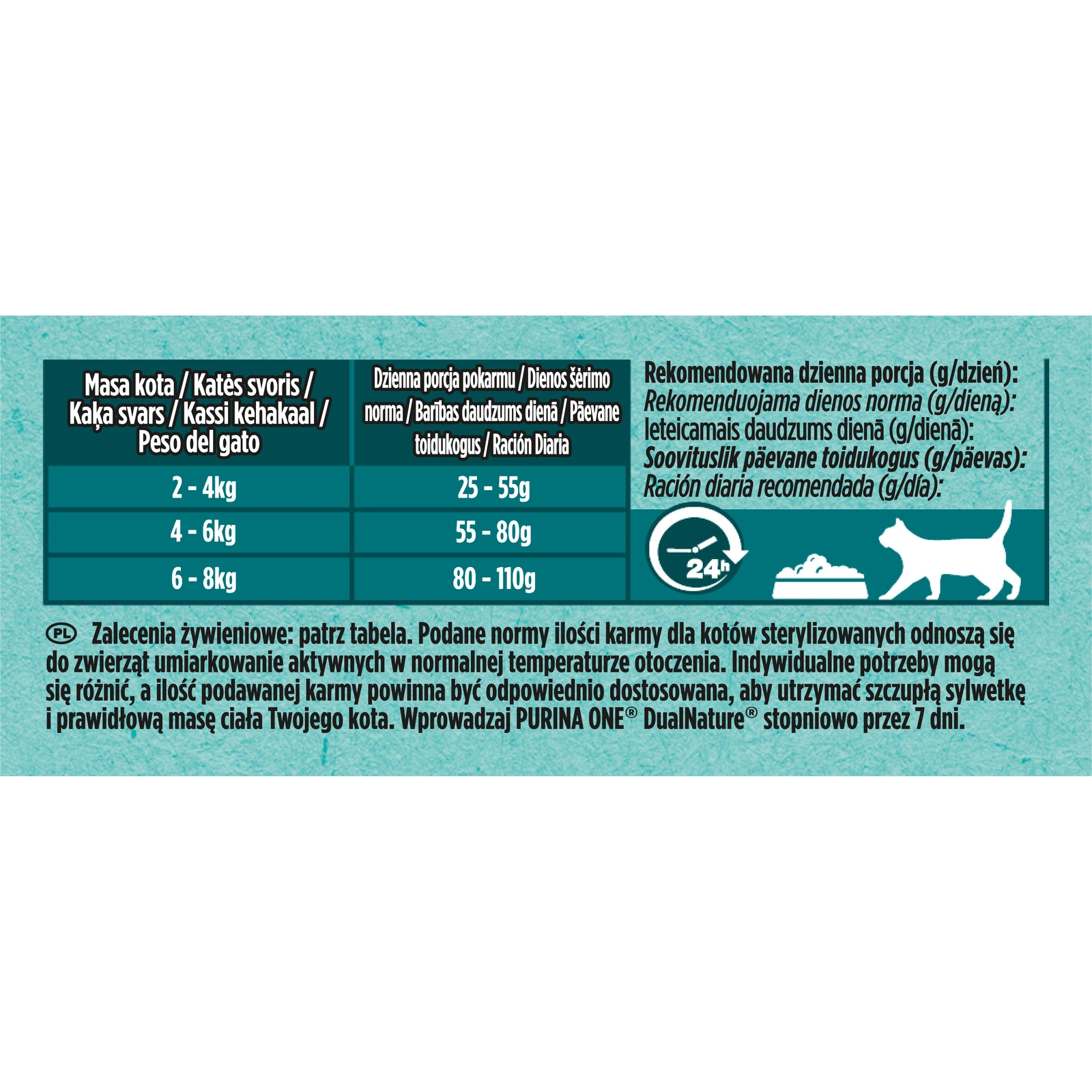 Recommended feeding amounts apply to moderately active adult cats in normal ambient temperature. Individual needs may vary. Adjust the amount fed to maintain a lean body condition and healthy weight. Introduce Purina One DualNature gradually over 7 days.
