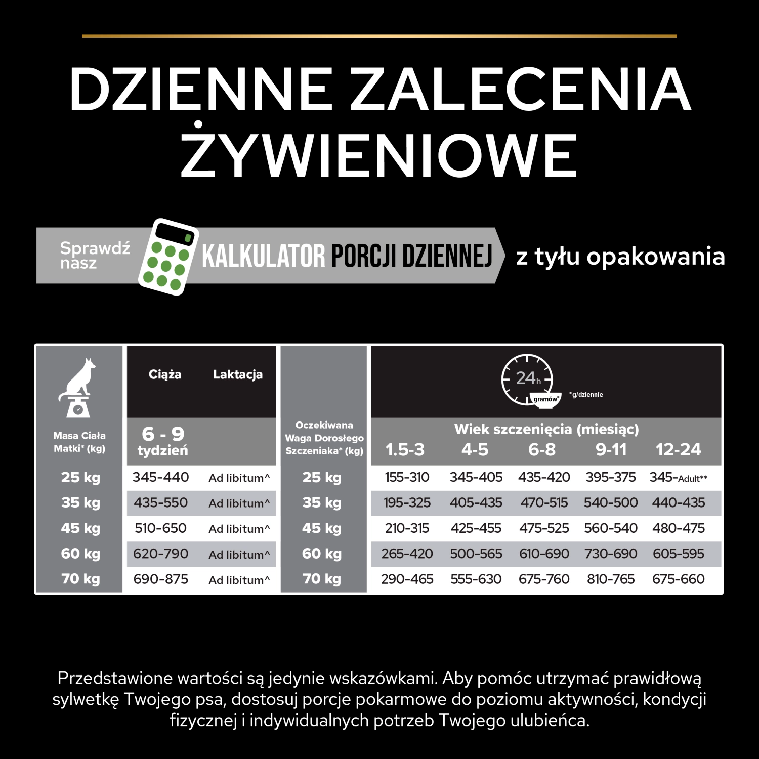 Nutritional recommendations: See table containing the recommended daily feeding amounts. The amounts provided are guidelines only. Ensure that the puppy and mother maintain a healthy weight, adjusting daily feeding amounts to the dog's activity level, physical condition, and individual needs. During weaning, solid foods should be gradually introduced. Clean, fresh drinking water should be available at all times. To monitor your dog's health, consult your veterinarian regularly.
