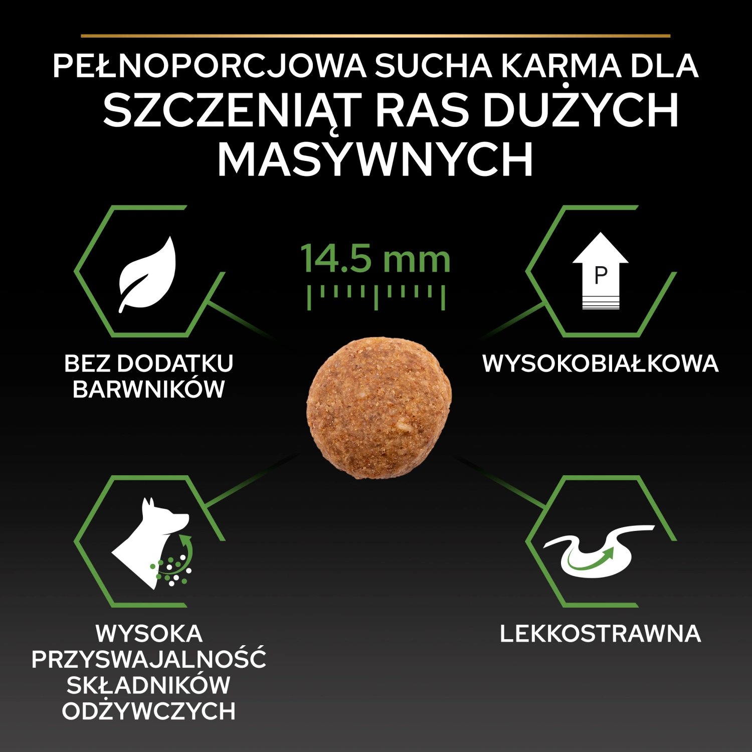 - This dry food is designed for puppies of large breeds with a stocky build, weighing 25–70 kg upon reaching maturity. It is also suitable for pregnant and nursing dogs.