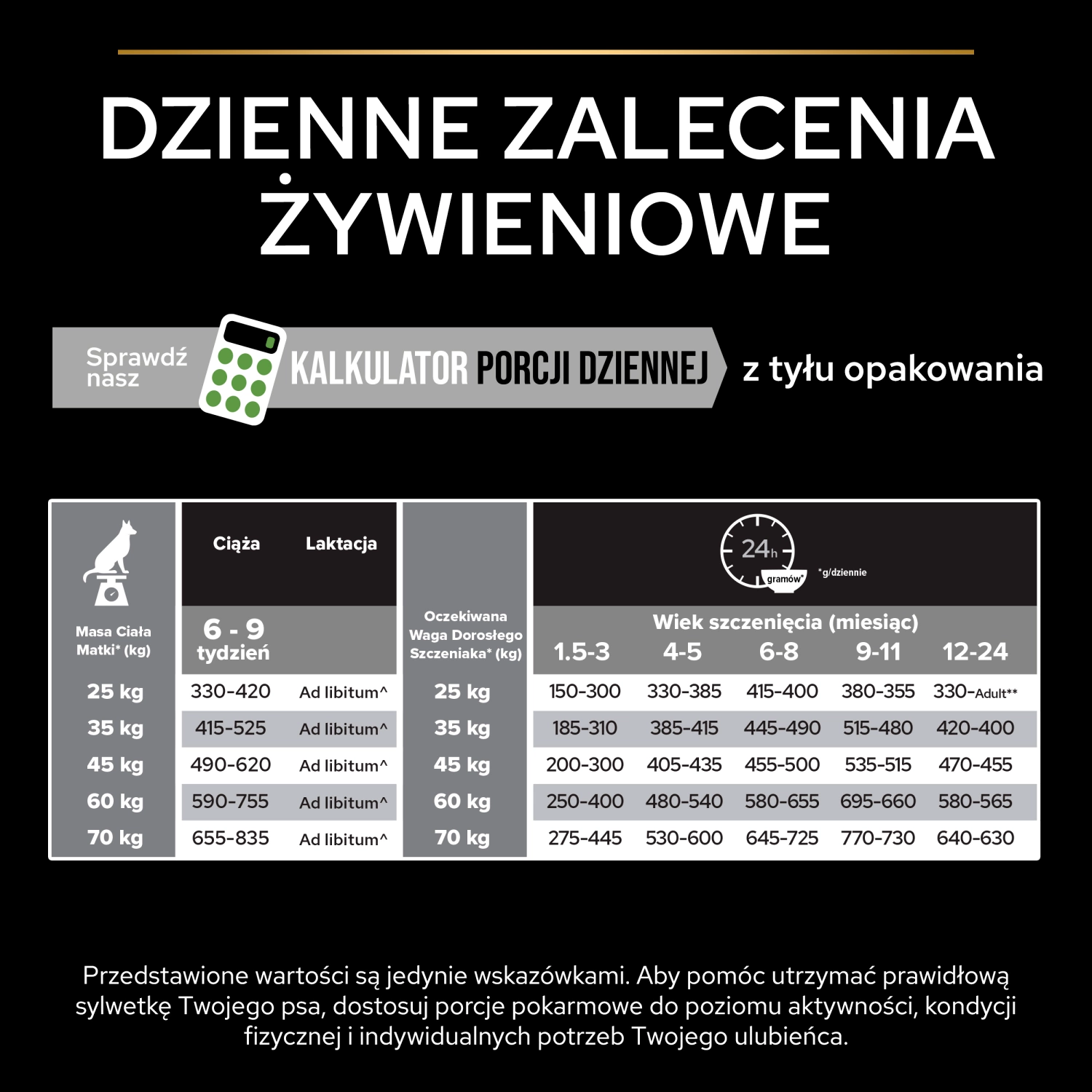 Dietary recommendations: Please refer to the table for recommended daily allowances. The amounts presented are guidelines only. Ensure that both puppy and mother maintain a healthy weight, adjusting daily feeding amounts to the dog's activity level, physical condition, and individual needs. During weaning, gradually introduce solid foods. Clean, fresh drinking water should be available at all times. To monitor your dog's health, consult your veterinarian regularly.