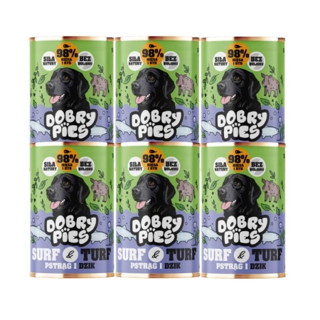 Dobry Pies loves both fish and meat! Why limit yourself? With Surf and Turf, you don't have to compromise! This high-quality, complete wet dog food combines the flavors of land and sea. It contains a large amount of muscle meat and carefully selected additives to support your pet's health and well-being every day. The unique composition of ingredients makes each meal not only exceptionally tasty but also natural and rich in nutrients. Surf and Turf is an excellent choice for dogs who value variety.