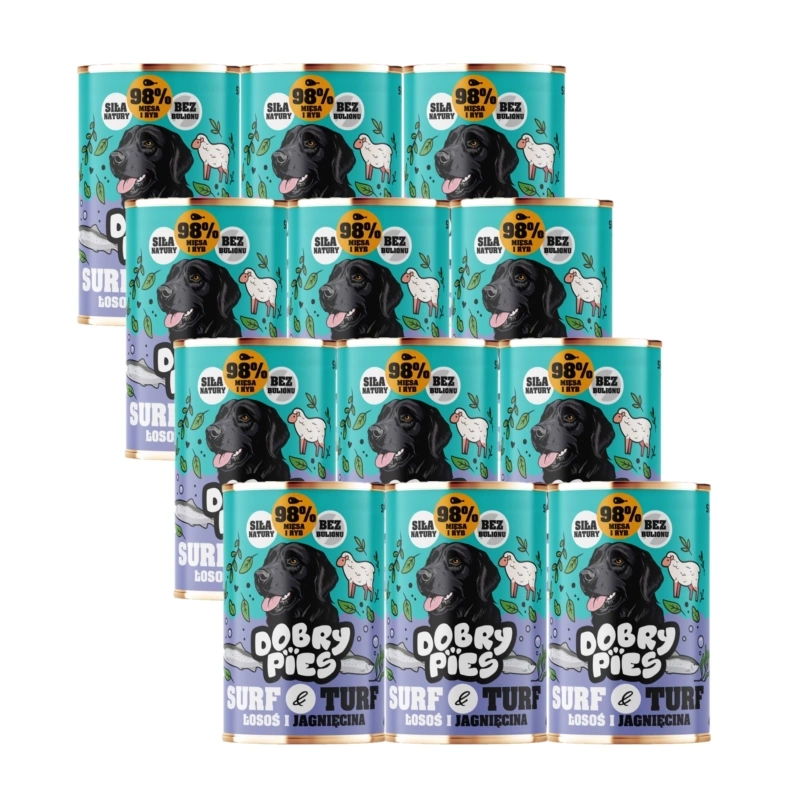 Dobry Pies loves both fish and meat! Why limit yourself? With the Surf and Turf line, you don't have to compromise! This high-quality, complete wet dog food combines the flavors of land and sea. It contains a large amount of muscle meat and carefully selected additives to support your pet's health and well-being every day. The unique composition of ingredients makes each meal not only exceptionally tasty but also natural and rich in nutrients. Surf and Turf is an excellent choice for dogs who value variety.