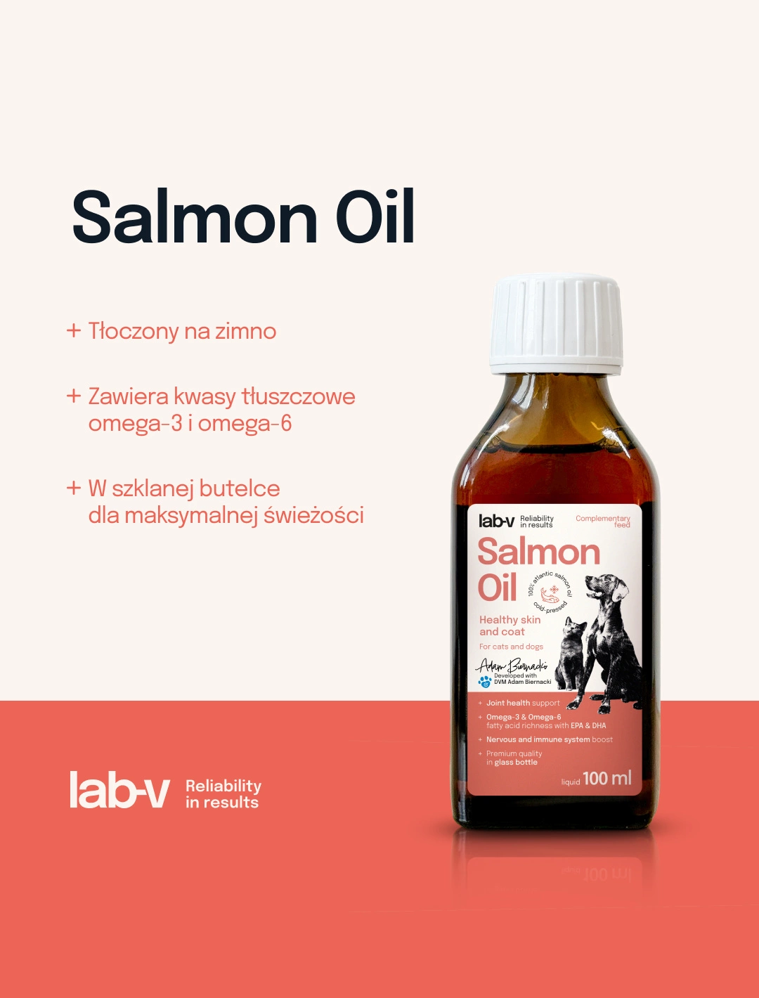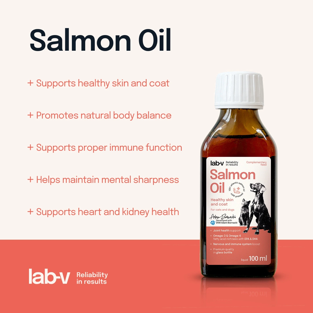 - Lab-v Salmon Oil is the key to your pet's health and well-being. Salmon oil is a natural source of omega-3 and omega-6 unsaturated fatty acids, which are essential in an animal's diet and contribute to healthy skin.