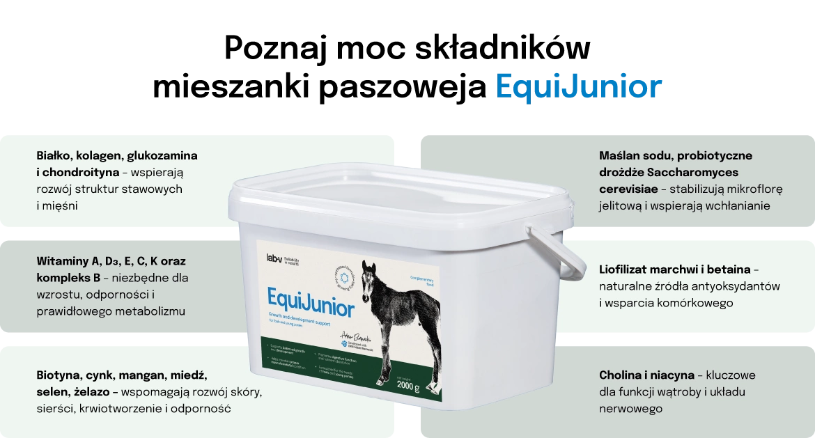 - EquiJunior is a comprehensive complementary feed mix, developed by veterinarians for foals and young ponies during periods of intensive growth. It contains a set of nutrients essential for the proper development of the skeletal system.