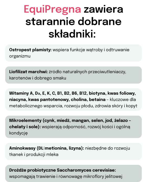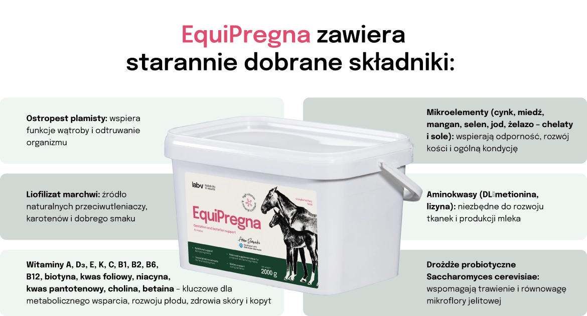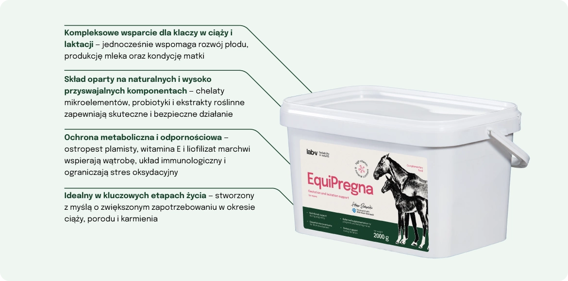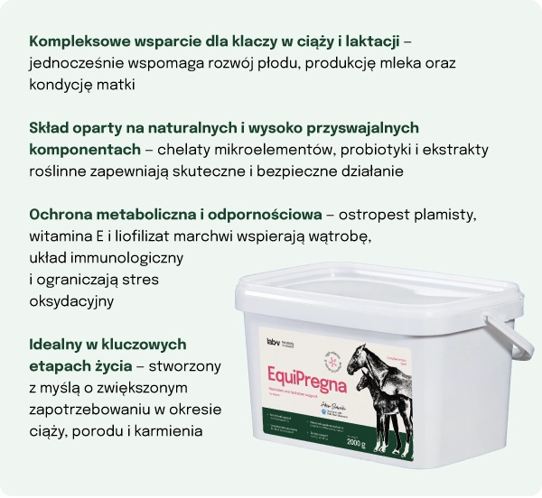 - EquiPregna is a specialized complementary feed mixture developed by veterinarians for pregnant and lactating mares. The product provides essential vitamins, trace elements, amino acids, and valuable plant extracts, supporting proper