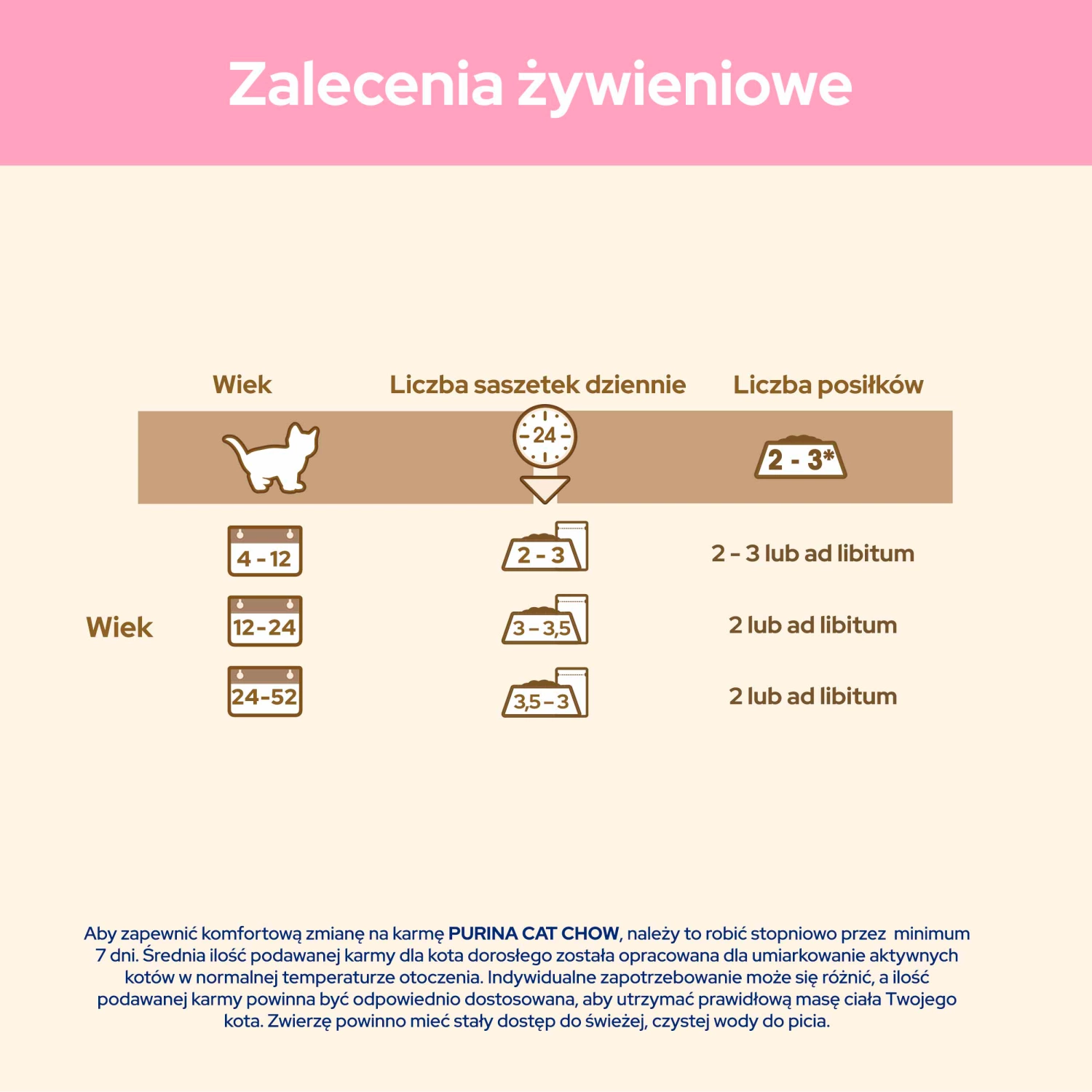 4–12 weeks old: 2–3 sachets daily, divided into 2–3 meals or ad libitum