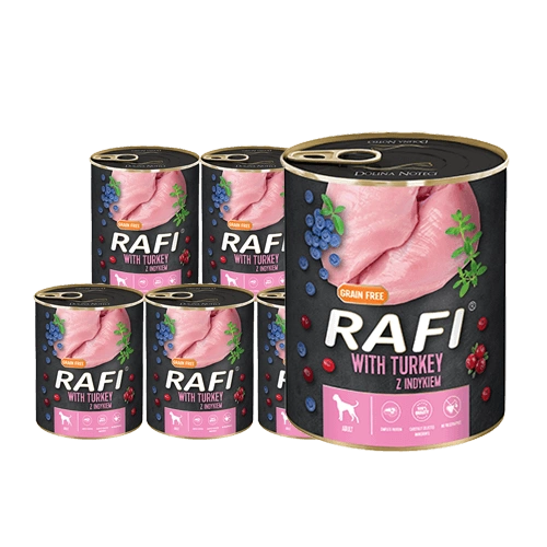 Complete wet food for adult dogs of all breeds - with turkey. Apart from containing complete protein rich in lysine and methionine, the meat and raw materials from turkey are a source of valuable polyunsaturated fatty acids, especially of the n-6 family, which have a beneficial effect on the skin and coat. The addition of linseed oil enriches the feed with many biologically active compounds, mainly phytosterols, which regulate lipid metabolism and improve the function of the digestive tract.