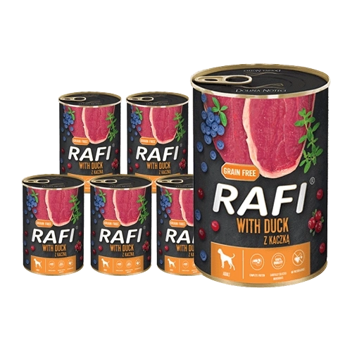 Complete wet food for adult dogs of all breeds, with duck. This Rafi wet food, thanks to the use of meat and raw materials of animal origin from duck, is a source of complete protein containing all essential amino acids. The food with duck contains selenium, copper and iron in the right proportions, thus covering the daily requirements of an adult dog. The addition of thyme enhances the aroma and flavour of the feed and supports digestive functions. Blueberries protect the body against free radicals and cranberries prevent urinary tract infections.