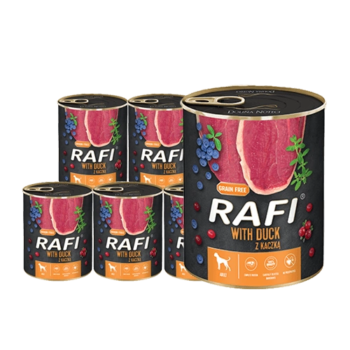 Complete wet food for adult dogs of all breeds, with duck. This Rafi wet food, thanks to the use of meat and raw materials of animal origin from duck, is a source of complete protein containing all essential amino acids. The food with duck contains selenium, copper and iron in the right proportions, thus covering the daily requirements of an adult dog. The addition of thyme enhances the aroma and flavour of the feed and supports digestive functions. Blueberries protect the body against free radicals and cranberries prevent urinary tract infections.