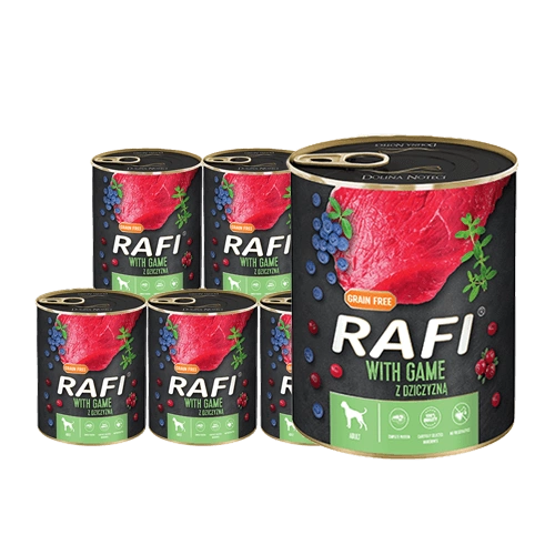 Complete wet food for adult dogs, all breeds, with venison. Rafi wet food with venison is characterised by its high content of complete protein and unsaturated fatty acids, mainly n-3 responsible for supporting immunity. Meat and raw materials from game supplement the recipe with the amino acids methionine, isoleucine and cystine. The food contains selenium and copper in quantities covering the needs of an adult dog.