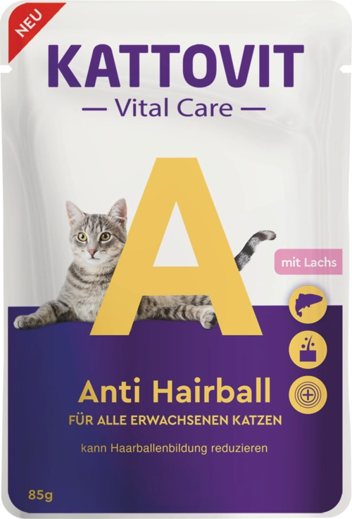 Kattovit Vital Care Anti-Hairball can reduce hairball formation thanks to the addition of malt and is enriched with tasty salmon. Developed in collaboration with nutritionists, Kattovit Vital Care combines functional nutrition with excellent taste. This balanced, complete food can help your cat live a more vital life. Protect Complex - enriched with taurine and vitamin A, which your cat needs to be actively supplied, this special formula of active ingredients can strengthen the immune system. For all adult cats
