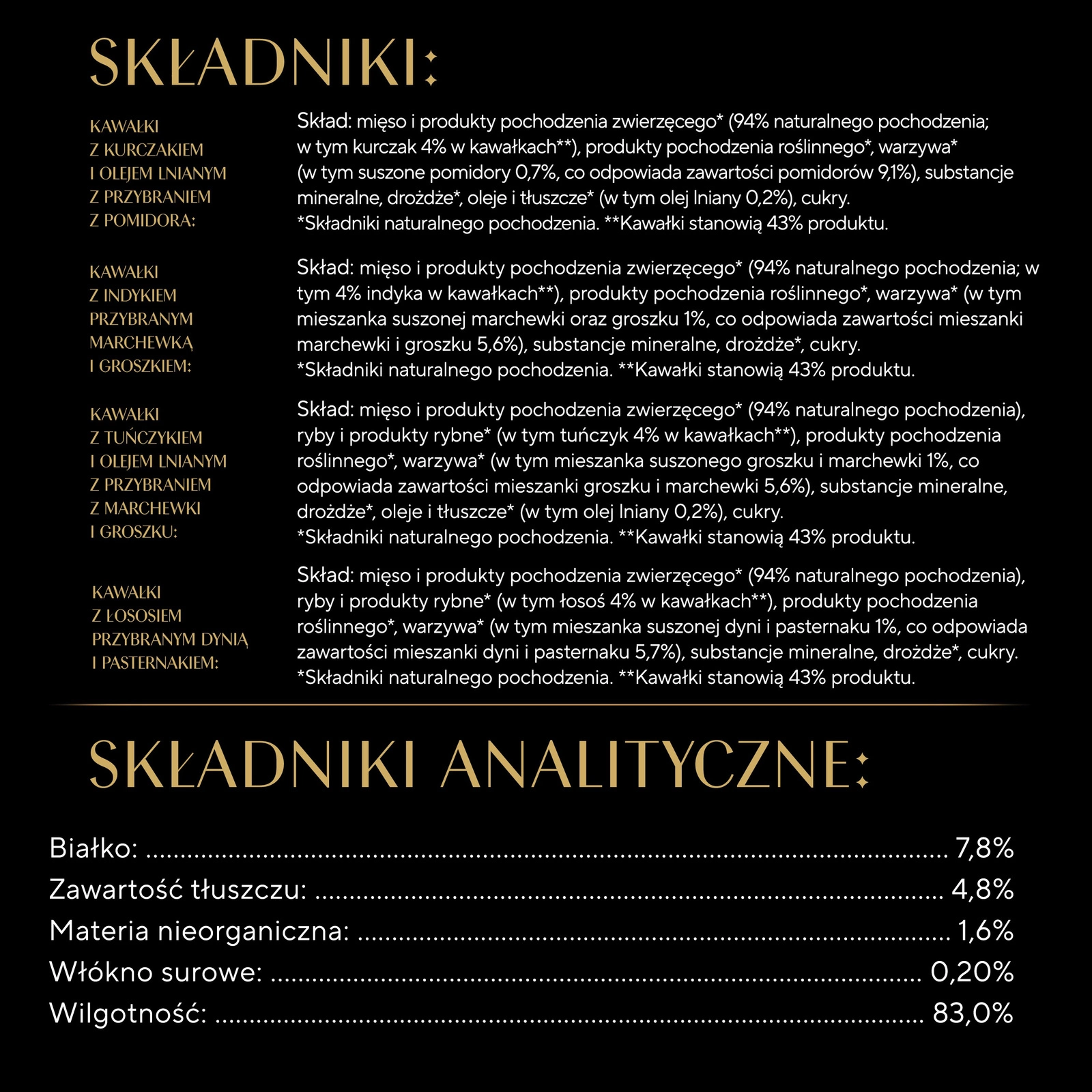 Chunks with tuna and flaxseed oil with a carrot and pea garnish: Ingredients: meat and animal derivatives* (94% natural origin), fish and fish derivatives* (including 4% tuna in chunks**), derivatives of vegetable origin*, vegetables* (including a dried pea and carrot mix of 1%, equivalent to a pea and carrot mix of 5.6%), minerals, yeast*, oils and fats* (including 0.2% flaxseed oil), sugars. *Ingredients of natural origin. **The chunks constitute 43% of the product.